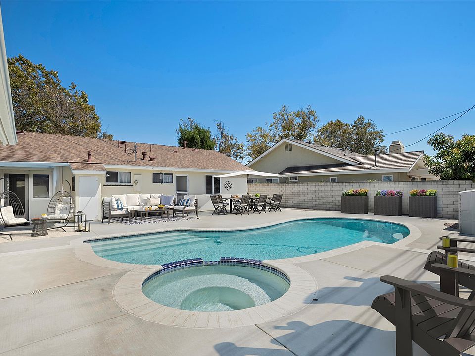 Nestled on a quiet interior street in the sought-after community of Rossmoor, this beautifully maintained 3-bedroom, 2-bathroom home is available for lease for the first time. Pride of ownership shows throughout, with thoughtful updates and a layout designed for both comfort and entertaining. The vaulted-ceiling living room with fireplace and built-in bookshelves sets a welcoming tone, while a second family room or oversized dining area offers flexibility for gatherings. The sun-filled kitchen provides abundant cabinetry, generous counter space, and a full suite of appliances. Luxury vinyl plank flooring flows through the primary bedroom and common areas, complemented by brand new carpet in the two secondary bedrooms. Central heating and air conditioning keep the home comfortable year-round, and a washer and dryer are included. Outdoors, the beautifully landscaped front yard leads to a private backyard retreat with a sparkling pool, jacuzzi, and a convenient outdoor shower perfect for rinsing off after trips to the beach so sand stays outside. A long driveway provides plenty of parking, and the attached garage offers shelving for additional storage. This home has long been cherished as a family residence and is now available as a rental, offering the opportunity to live very close to Rossmoor Elementary Middle School, and Los Alamitos High School. With tree-lined streets, top-rated schools, and easy access to shopping, dining, and parks, Rossmoor remains one of the area's most desirable neighborhoods. Minimum 12 month lease. Owner pays landscaping and pool maintenance. Tenant pays all utilities. Pets will be considered with positive landlord references