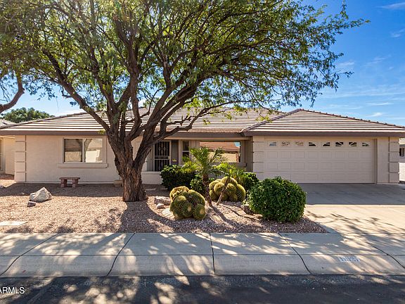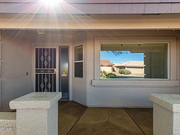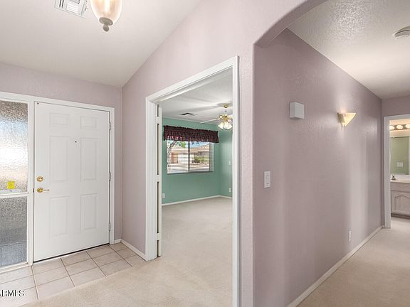 Come see this wonderful 3 bed, 2 bath home in the active adult Community of Sunland Springs Village! A 2-car garage with 2' added for extra room , lovely desert landscape, and a cozy front porch are just the beginning. Discover a spacious living/dining room, vaulted ceilings, designer palette, soft carpet & tile floors t/out, and natural light. The kitchen boasts SS appliances, recessed lighting, cabinetry & counter space, and a bright breakfast area. Enter the master bedroom to find an ensuite with dual sinks & a walk-in closet. Another bedroom with a double-door entry, a walk-in closet, & built-in shelves can be an office as well. Out the back, you have a covered patio to relax after a busy day. Come and see this today!