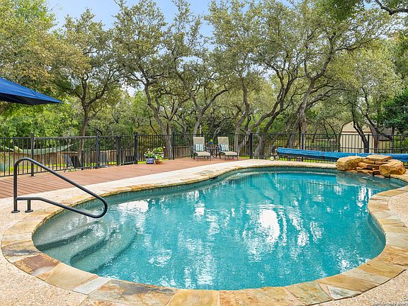 Embark on a seamless blend of urban convenience and rural allure within the Hearthstone Ranch enclave-a meticulously maintained neighborhood celebrated for its seclusion and serene atmosphere. Set upon nearly an acre of meticulously landscaped grounds, this enchanting single-story stone estate beckons as a tranquil refuge from the urban frenzy. Indulge in the luxury of a 4-bedroom, 3.5-bath haven, boasting a spacious primary suite adorned with 12' ceilings, dual closets, and dual vanities-a sanctuary within. A secondary bedroom suite with ensuite, and two additional bedrooms with a shared bathroom, each a haven of comfort and sophistication, complete the accommodations. The kitchen, a gourmet's delight with a walk-in pantry and a central island, seamlessly merges with the living area-an inviting space for communal moments. The thoughtful and functional design features a dedicated office space for focused work and a versatile library/exercise room-a space that adapts to your every need. Venture outside to discover not one but two decks, each crafted with TREX planking-a premium touch that combines beauty and durability. These decks lead to a captivating Keith Zars pool adorned with a soothing waterfall, transforming the space into a retreat within a retreat for those sun-soaked Texas afternoons. Enhancing the outdoor haven is a state-of-the-art, expansive solar array, ensuring sustainable living and reducing your ecological footprint. A screened-in outdoor kitchen, electrified for convenience, features a wood-burning fireplace, refrigerator, grill, TV, and a grand iron table with chairs-perfect for entertaining and serene evenings. Gather around the stone firepit, soaking in the expansive backyard, which graciously abuts a greenbelt for year-round privacy and ambiance. This residence isn't merely a dwelling; it's a retreat where every day unfolds like a vacation. Nestled within a community committed to security and tranquility, this haven, with its solar-powered efficiency, remains effortlessly proximate to city amenities-striking the perfect balance between seclusion, sustainability, and accessibility. Welcome to your private sanctuary at the crossroads of convenience, tranquility, luxury, and exceptional outdoor living.