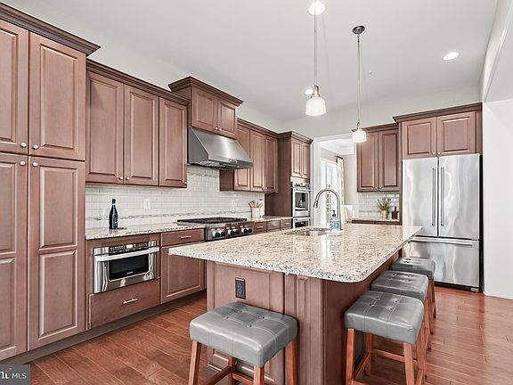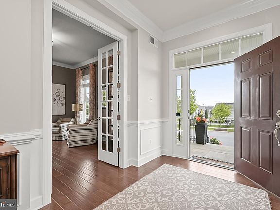 Absolutely stunning Mitchell & Best “Dover” model in the Garden District of Maple Lawn perfectly positioned on a desirable large corner lot leads with beautiful indoor and outdoor entertaining spaces, quality features and upgrades, and considerable private quarters. This unforgettable property offers well-curated living spaces, sophisticated trim, beautifully landscaped exterior with low-maintenance perennials and irrigation system, inviting covered front porch, private fenced yard, huge storage capacity, a low-traffic area near a playground, and much more! The entry foyer is a wonderful welcome to this elegant home, catching your eye immediately with sidelights and transom window. Anchored by the foyer is a distinguished home office with elegant French doors allowing you to work from home with ease. The gracious floor plan further provides a formal dining room well-suited for intimate entertaining and celebratory meals. Inspire your inner chef in the kitchen appointed with 42-inch cabinetry, high end stainless steel appliances, center island with breakfast bar, granite counters, tile backsplash, and a wonderful casual dining space with patio access. Spend quality time with loved ones in the family room conveniently situated off the kitchen; this bright and comfortable room is characterized by a custom coffered ceiling and cozy fireplace. Expertly delivering in both form and function is a varied use room off the garage with a custom walk-in pantry and mud room with drop-zone. The second level is an exciting collection of 4 bedrooms and 3 full baths. The primary suite is its own paradise with two custom walk-in closets and a luxurious en-suite bath adorned with separate vanities, soaking tub, oversized shower, and a water closet. A second bedroom with a private attached bath and lounge area, third and fourth bedrooms with a shared hall bath, and laundry room conclude the upper level. The sprawling lower level presents opportunities for hobbies and recreation with large open areas, second fireplace, a full bath, and plumbing for a wet bar. The lower level also offers an expansive storage room and potential for an easy addition of a fifth bedroom, second home office, or exercise room. Outdoor entertaining is easy and enjoyable with a paver patio featuring a built-in gas fire pit and a fenced backyard. The home is also outfitted with an attached 2-car garage with electric car charging outlet, additional driveway parking with 3 spaces, and an active radon mitigation system. Enjoy the ease and convenience of having shopping, dining, and entertainment options all within the Maple Lawn community. An array of amenities await your arrival, including an outdoor pool, community center, fitness facility, multiple playgrounds, picnic pavilion, dog park, basketball, tennis, and pickleball courts, and so much more! Sparing no expense, this remarkable property aims to please and is truly the embodiment of Maple Lawn’s good life!