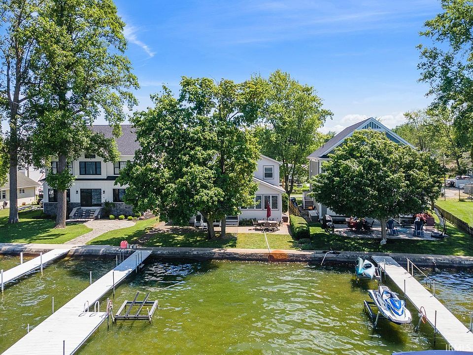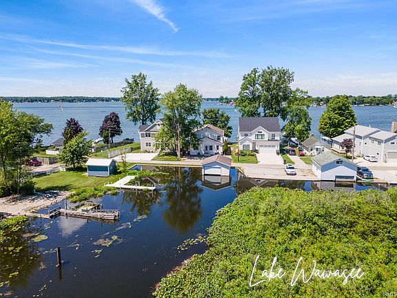Experience golden hour like never before from this beautifully updated, turn-key Lake Wawasee retreat offering 50 feet of prime lake frontage and incredible open-concept living! Pier #176 is set in a quiet, no-through-traffic location with serene views, unforgettable sunsets, and easy access to the lake with flat walkout! This furnished 6-bedroom (primary on main floor), 2 full/2 half bath home is ready for immediate enjoyment. Step outside to your brick lakefront patio and soak in panoramic sunset views and the sounds of nature. Enjoy a sandy-bottom shoreline perfect for swimming, plus your private boathouse just across the quiet drive perfect for extra storage. Spend your weekends boating to 3 on-the-water restaurants, watching the 4th of July fireworks, or gathering lakeside year-round. Whether you're hosting the whole crew or savoring quiet mornings by the water, this home delivers exceptional space, views, and lifestyle. The main floor features a spacious primary suite with walk-in shower, an expansive great room with wall-to-wall lake views, a chef’s kitchen with central island & stainless appliances, and multiple seating and dining areas ideal for entertaining. There’s also a flex room with built-ins — perfect for reading, working remotely, or relaxing in peace. A large walk-in pantry, second fridge, and main floor laundry add convenience. Upstairs offers 5 additional bedrooms with generous closet space, a dual-sink full bath, and another half bath — providing plenty of room for extended family or guests. Property provides plenty of parking space, making it convenient for everyday use. Located just 11 minutes from downtown Syracuse and within 30 minutes of Goshen, Warsaw, and about an hour from Fort Wayne and South Bend, you’ll have easy access to local amenities while enjoying the peace and privacy of lake life. Floor plan available. Furniture included — just bring your toothbrush! Lake Wawasee homes with this level of space, sunset frontage, and turn-key convenience rarely last — schedule your private tour today.