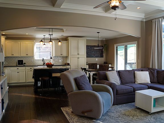 You will fall in love with all the extra details in this 2600-plus square foot custom-built ranch on a finished basement. The front of this brick home features Indiana limestone and double garage doors that lead to an expansive two car garage(27 x 25.5). Out back you have covered deck with ceiling fan and attached concrete patio area, which is perfect for entertaining. It has easy flow into the home with a sliding patio door. The interior features include many ceiling details and crown moldings. The living area has a nice flow with open concept and large windows, illuminating the beautiful coffered ceiling detail, arched entryways and wood floors. It leads right in to the kitchen with an abundance of cabinets, furniture-style island, tile backsplash, Kohler farmhouse sink, large pantry cabinet, and honed black granite. The master bath includes HEATED tile floors, a large shower, and a SPACIOUS closet. An additional two bedrooms on the main level include WALK-IN closets