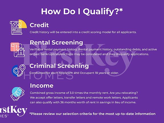 FirstKey Homes, LLC is an Equal Housing Lessor under the FHA. Applicable local, state and federal laws may apply. Lease terms and conditions apply. This is not an offer to rent—you must submit additional information for review and approval. Listed features may not be accurate; confirm details with a leasing representative. Certain cities and municipalities – including St. Louis and Chicago – require a home inspection prior to a new resident taking possession of the home. If you are leasing a home in one of these areas, please note that your move-in date could be adjusted to accommodate inspection requirements. Please ask your leasing agent for more details. BEWARE OF RENTAL SCAMS: FirstKey Homes exclusively manages our homes (no third-party management). We do not lease homes through Craigslist, SocialServe, LetGo, Facebook Marketplace or other classified advertising services. We will never ask for wire transfers, cash apps like Venmo, Zelle, CashApp PayPal, or any other transferring method to collect funds. See FirstKey Homes website for full details and conditions. Listing photos are provided to help you select a home; all photos shown are for representative and illustrative purposes only but may not be exact. Colors and photo size may vary based on different resolutions, hue, brightness, contrast, or other photo variations. Photos on websites may be modified, changed, or amended at any time. For new construction homes, actual homes may vary, photos may be of similar home/floorplan, home may be under construction and photos may not be of actual home, individual homes, amenities, features, and views may differ. If you have any concerns, please schedule a tour prior to applying or leasing the listed home.