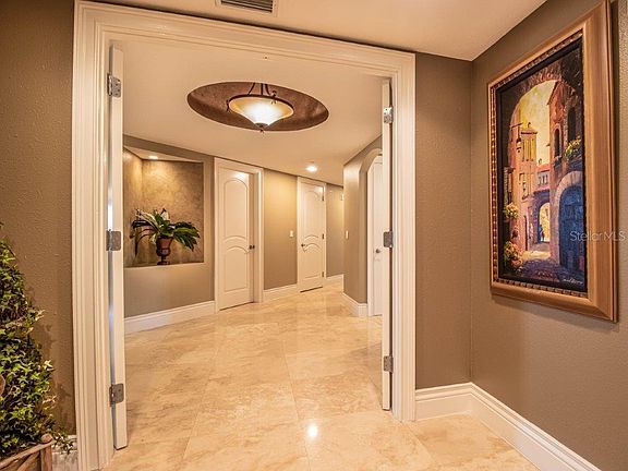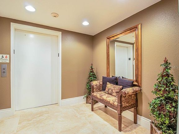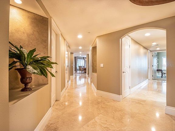 Luxury, quality and attention to detail is evident in this well loved and impeccably cared for home located across the street from the world famous treasure island beach and directly on the water leading out to the intercoastal and the Gulf. This exceptional 3495 sq ft 3/3.5 plus den/theater room offers the finest in maintenance free living. This unit has a rare private over sized 2+ car garage with storage galore and workshop area that conveniently opens onto the elegant foyer entry allowing you quick access to your home via one flight of stairs or semi-private elevator. This very spacious floor plan has upgraded travertine floors. Remodeled Kitchen features top of the line cabinetry, a large upgraded multi level granite breakfast bar, SS appliances, double dishwasher, Sub Zero refrigerator and double drawer additional fridge in the kitchen and top of the line cabinetry. Separate laundry room features, double washer and dryer. . The butler's buffet area features a wine cooler and a spacious pantry. One of a kind remodeled extended kitchen area creates a superior flow for entertaining which offers beach views and access to a large covered balcony looking out towards the Gulf of Mexico. The luxurious great room provides custom window treatments and crown molding as it opens to a private 900 sq ft covered patio with a 10-person hot tub/swim spa. Large master suite provides water views, balcony access, spacious custom designed walk-in closet and elegant master bath with bidet. 2nd and 3rd bedrooms enjoy private full baths, spacious closets and a large covered balcony with views of the beach and Gulf. Enjoy the community pool, walk a few steps to the beach/Gulf or to the private marina for the complex with the ability to rent a slip! The finest beachfront luxury in a 2 building complex on an acre of land.There is a 23' Starcraft boat available on a rented slip behind the unit.
