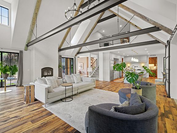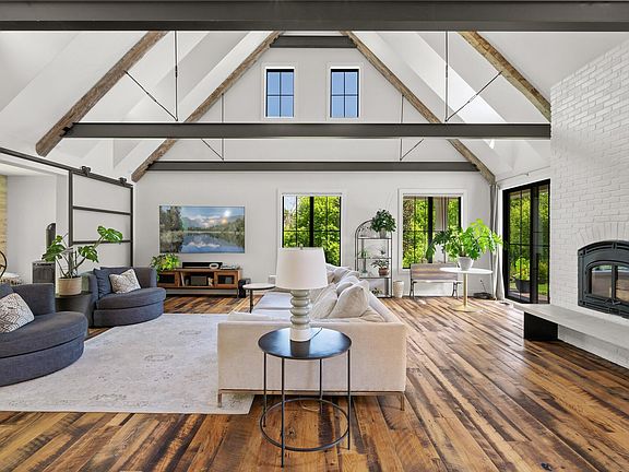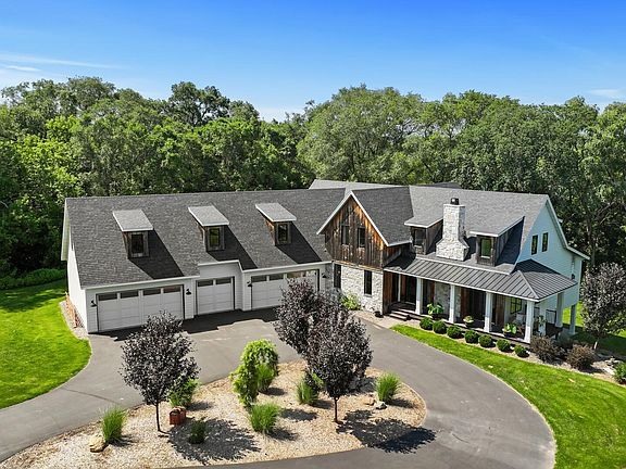 Nestled on over 16 acres in the sought-after Lakeville school district, this stunning secluded custom-built home offers unparalleled privacy and luxury. Great room boasts reclaimed oak hardwood floors from the Jim Beam Distillery, a soaring 28-foot vaulted ceiling, and a cozy Accucraft wood-burning fireplace. Elegant kitchen features Brazilian Quartzite and Granite countertops, a Thermador 48" Dual Fuel Professional 6-burner range, and walk-in butler's pantry. Main level primary bedroom with a luxurious ensuite bathroom and private laundry access. Main level also includes a four season porch and powder room. Versatile upper-level loft, with 3 bedrooms. Lower-level family room, additional bedroom and workout room. 60x30 outbuilding with heat and air conditioning. Dual covered patios, lush landscaping with an in-ground irrigation system, and nature trails. Attached 5-car heated garage with stairs to unfinished bonus loft. Many modern updates ensure comfort and efficiency.