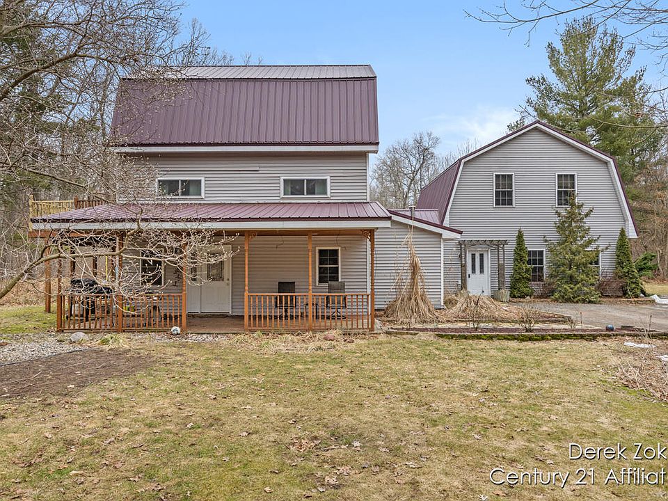 Seller is willing to pay up to $9,000 to lower buyer's interest rate by 2% with an acceptable offer! This property boasts a 3-story main dwelling with 3 spacious beds, kitchen, den, and a versatile sun room. The primary suite encompasses the 2nd story with a large private deck. Connected by a breezeway, discover a 2-story addition with hookups for an additional kitchen, perfect for a 2 bedroom rental or 2nd living quarters. Step outside onto multiple decks overlooking lush gardens, fruit trees, and a sprawling yard with underground sprinkling. The home is protected by a 2 year old metal roof with transferable warranty. Beyond lies the enchanting woods of the adjacent Manistee National Forest, where deer, turkey, and other animals roam freely. Just minutes from the highway. Call today!