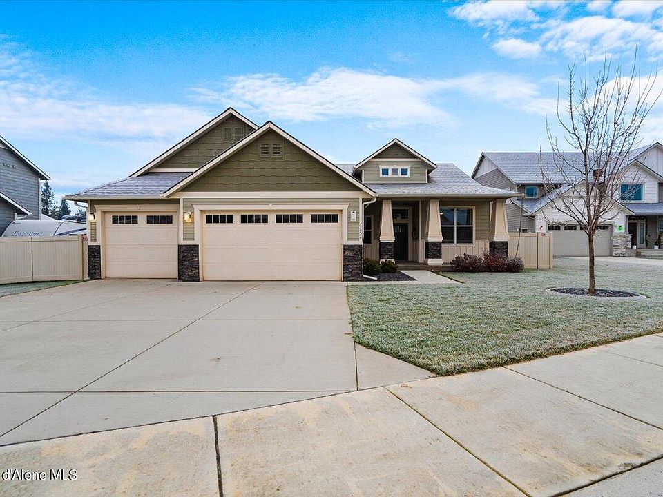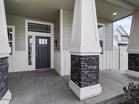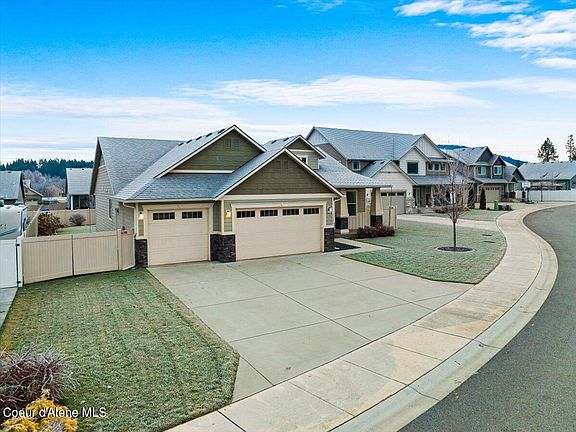 Stunning single level 3 bedroom, 2 bath home with an office in Hayden's Maple Grove neighborhood. Glorious morning sun in the living area primary suite offering Canfield Mountain Views, huge walk-in closet, tiled shower and soaker tub. Vaulted ceilings, open floor plan with split-bedroom design. Gourmet kitchen overlooking the beautifully landscaped backyard, quartz countertops, large walk-in pantry, and stainless-steel appliances. This home has generous-sized rooms, a bright and modern look, an office, A/C, gas fireplace with stone facing, hearth and mantel. Situated in a quiet location on a .26-acre, fully fenced and landscaped lot with front and rear sprinkler system, concrete curbing, and an oversized, partially covered patio. Side gate to graveled RV parking area. Looks and feels brand new, but better than new with landscape and fence in, and custom window coverings throughout. This home is a gem.