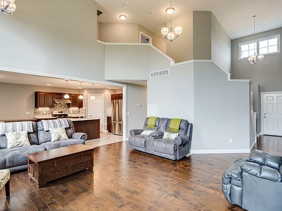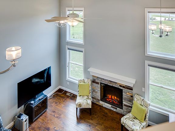 Custom built 1 year old Craftsman style 4 bedroom home with stacked stone & vinyl shake exterior details, set on a corner lot with expansive front yard neighborhood pond & woodland views. The covered front porch is perfect to relax & enjoy this scenic landscape. The floor plan provides 3500+ of quality living & entertaining space. The main living area has a dramatic 2 story entryway that continues into the great room with soaring ceiling, featuring that gorgeous Craftsman stone on an electric fireplace flanked by double stacked floor to ceiling windows. 3 Chandeliers enhance this space. A French door gives access to the den that could also be utilized as a formal dining room. Beautiful hardwood flooring from entryway, den & great room. The thoughtfully designed kitchen provides tons of cabinetry for organization, a corner walk-in pantry, under cabinet lighting & tiled backsplash. Pendant lights highlight the working island with breakfast bar for casual meals. A full complement of stainless kitchen appliances are included as well as a stainless hood w/external ventilation above the stove. The adjacent dining area is large enough for a complete dining set. A desirable first floor master suite has an en-suite bath with vanity & makeup counter, private water closet, a walk-in closet & separate linen closet. A striking open stairway leads upstairs to 3 additional good-sized bedrooms, plus a 2nd full bath. The fully finished basement is enormous with plenty of space to entertain in the spacious L shaped family room. A 2nd half bath & mechanical/storage room complete this floor. Special details include a main floor laundry room equipped w/a double bowl utility sink, tiled backsplash & shelf for storage, finished 3 car garage for added flexibility, ceiling fan in great room, quiet/powerful fans in both full baths, modern styled light fixtures, all LED lights, safety first carbon monoxide detectors, hydro-pump in basement, plus custom light filtering window shades. Immaculate and move-in ready, this home has a neutral décor & white trim package, with a multitude of windows for that open, light filled sought after environment.