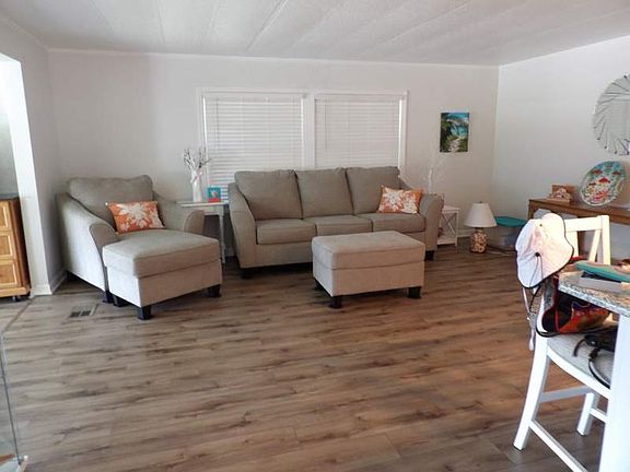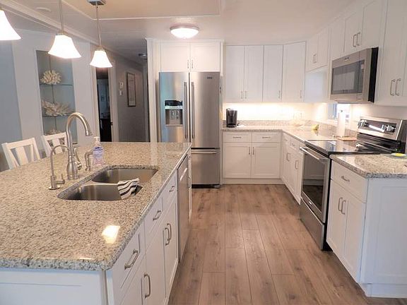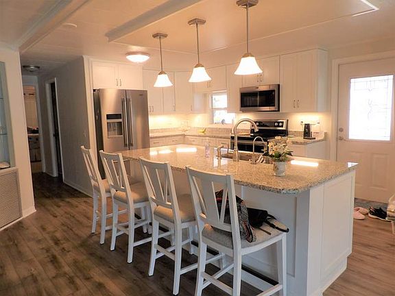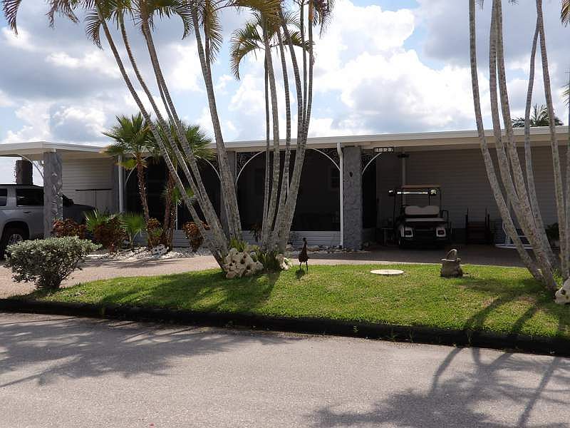 This home is a gem! The open kitchen/living room concept was completely remodeled two years ago. The beautiful white cabinets are soft-closed. It boasts a large island with seating for 4. New vinyl flooring was installed. There is reverse osmosis under the sink and in the ice box. This year a new roof was put on as well as new siding and windows. There is a half-circle driveway as well as a driveway with a carport. It has a screened-in lanai with a work shop to the left of the lanai. From the sitting room you can view the fountain in the pond which changes colors at night. This property sits on a corner lot. There are no other homes like it in the park. Call to schedule a personal showing.