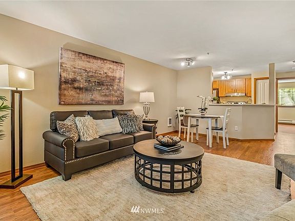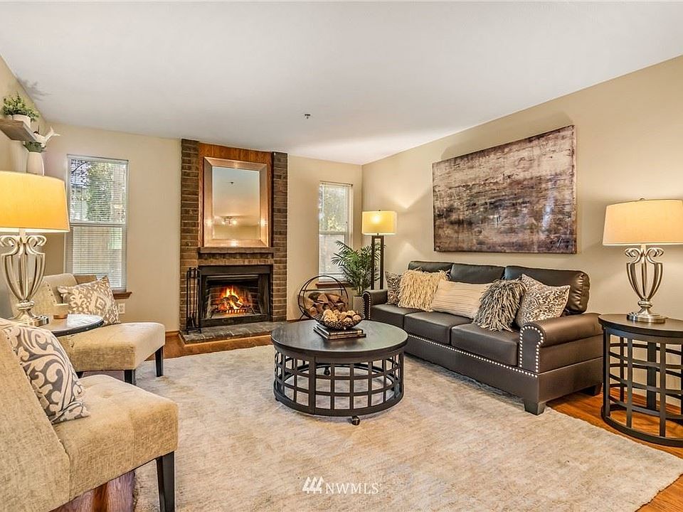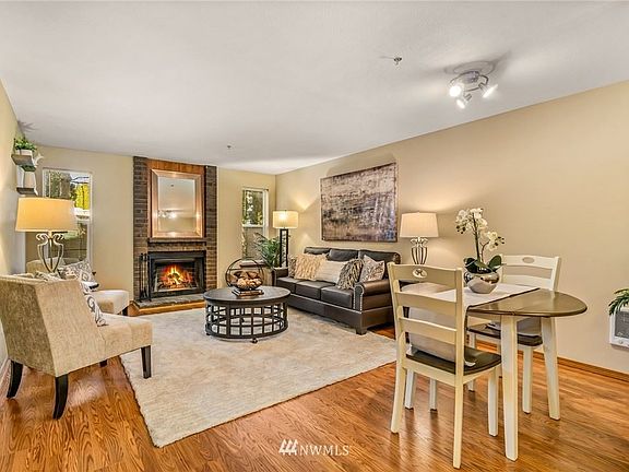 Awesome S. Everett location. Gated community w/well appointed club house, game rm, outdoor pool, hot tub & park. Very well kept condo has tile entry & counter tops, easy care pergo style floors, wood burning fireplace, kitchen is well designed w/pantry, updated appliances & is open to living room. 2 large bedrooms, master is huge with walk in closet. Full size W/D too! 2 assigned parking spaces