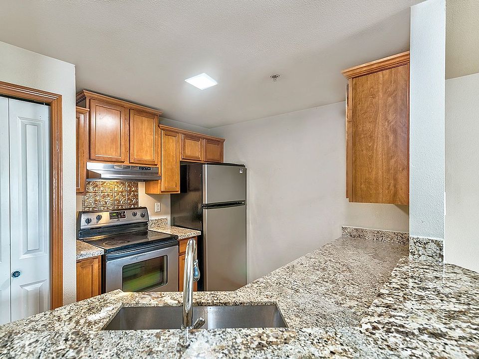 Charming one bed, one bath condo on 2nd floor with hardwood floors through out, except for carpeting in the walk -in closet. Wood fireplace, granite countertops, stainless appliances. balcony. One assigned parking spot #5. Amenities include pool, hot tub, game/exercise room, security gate. Owner pays for water & sewer and garbage. No pets. No smokers.