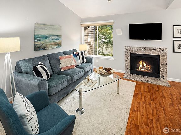 Carlisle Creek condo. Gated community. Top floor unit. One bedroom, one full bath. Heated tile floor in entry. Spacious living room with vaulted ceilings and wood fireplace. Laminate hardwoods. Dining area with slider leads to deck (w/storage unit) that overlooks small greenbelt. Feels private! Updated kitchen w/wood cabinets, granite counter, tile backsplash, stainless steel appliances, eating bar as well. Remodeled full-size bathroom with custom vanity, quartz counters & tiled shower. Heated tile floor! Primary with walk-in closet and laminate hardwood. W&D, 2 parking spots, one covered. Clubhouse, pool, exercise room. Close to all amenities and easy access to I5 & 405.
