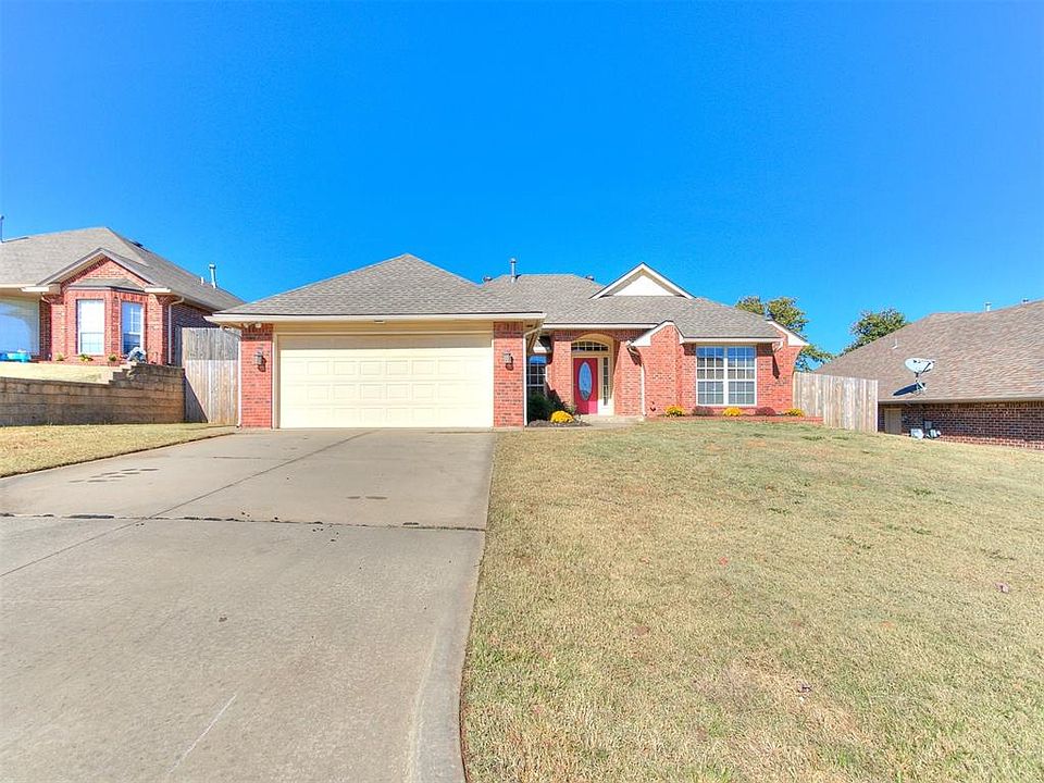 Welcome to this charming home in Oakwood East Village, with Choctaw NP Schools. This 3 bedroom, 2 bath home is conveniently located close to Tinker AFB. There's a study with a closet, that could be used as a 4th bedroom. The open concept living, dinning, kitchen is great for entertaining. Living area has a cozy gas log fireplace and lots of windows for natural light. French doors leading to the patio. Lots of beautiful woodwork, crown molding and cabinetry. Wood like laminate floors in most of the house, with new carpet in the bedrooms. Master suite features a tray ceiling, double sinks, a corner whirlpool tub, separate shower and walk-in closet. Sprinkler system and water softener are some of the extras. This community friendly neighborhood has fishing ponds, walking trails, picnic area, workout equipment, Frisbee golf and a basketball court.