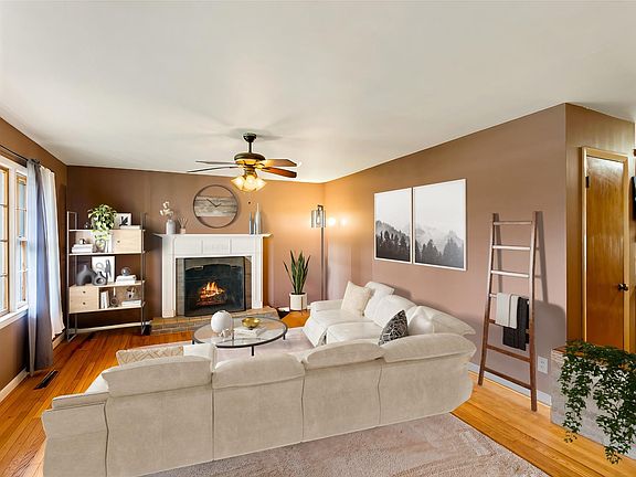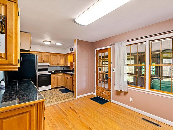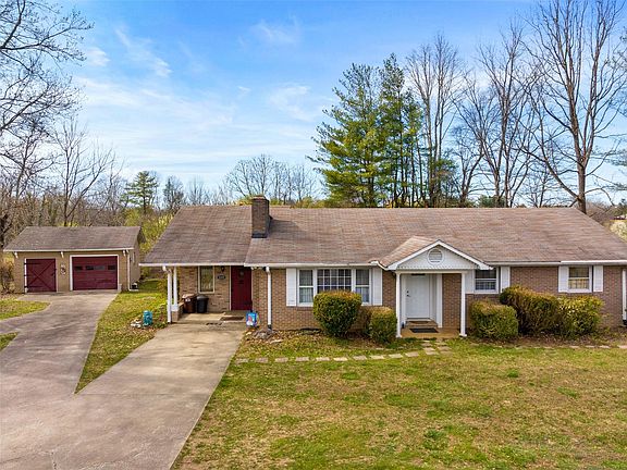 This sturdy brick ranch has almost 2,000 sf, on one level with no stairs. The living room has hardwood floors in good condition, and a fireplace. The kitchen has granite counters, a new stainless refrigerator, and built-in microwave. The kitchen flows into a dining room with built-in cabinets and hardwood flooring. Off the dining room is a sunporch with electric baseboard heat that goes the length of the rear of the home, overlooking the backyard. At the far end of the sunporch is an enclosed laundry area with room for a stackable washer and dryer. (Current laundry is in basement.) Exiting kitchen in other direction is a den with fireplace and outside entrance., Original hardwood floors, except in kitchen, bathrooms, den and sunporch. Usable basement. The .75 ac lot is triangle-shaped and mostly level, with an electrical outlet for RV. The detached brick bldg is 1/2 garage, and 1/2 storage, close to the kitchen and easy access.