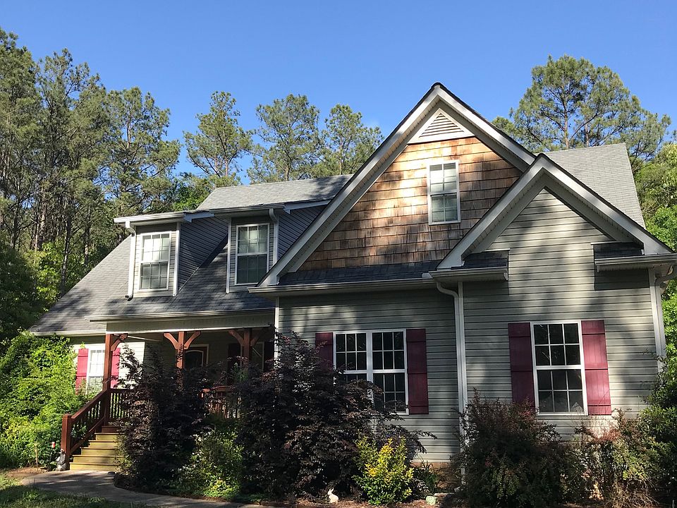Amazing heart of pine floors welcome the open concept living space with foyer, dining room, large living room with fireplace, kitchen with breakfast room, island with sink, custom cabinets, tons of counter space. Split bedroom plan with master on main. Master has tray ceiling. Master bath has garden tub, separate shower, water closet and large master closet. Upstairs has den/playroom, bedroom and office. 3.38 acres well off the road for privacy. Level lot with paved driveway. Two car garage. Lots of trees and wooded area. Front porch to relax and back deck to grill. Easy maintenance vinyl siding with cedar & stone accents. Convenient to Hwy 36 and Hwy 16. Just minutes to I-75 for commuting.
