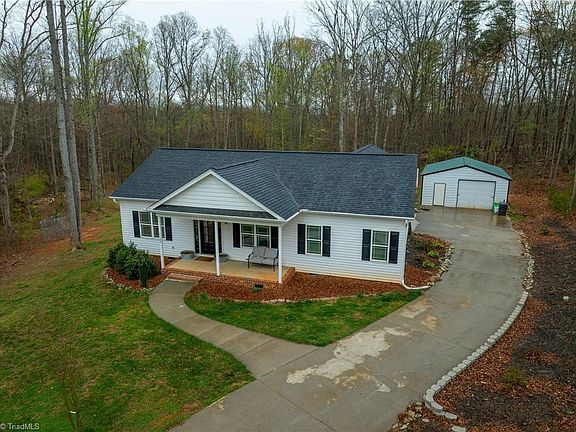 Its your chance to own over 4 private acres in Pilot Mountain! This charming one-level ranch home was completed in 2020 and offers a spacious split floor plan with three bedrooms and two full bathrooms. The open layout includes a cozy fireplace, a floating kitchen bar, and high ceilings throughout. Garage is oversized two-car attached garage with a wide entry, plus a detached 24'x30' building for additional storage/workspace. The roof features 30-year shingles, and the gutters are equipped with leaf guards for low maintenance. Spend your days relaxing on the back porch, soaking in the natural beauty and wildlife of the property. The kitchen showcases stunning knotty hickory cabinets and granite countertops, while the master bedroom features tray ceilings and a beautifully tiled shower in the en-suite bathroom. As an added bonus, the seller is offering a $1,500 paint allowance with a full-price offer to address minor scuffs and areas where pictures were previously hung.