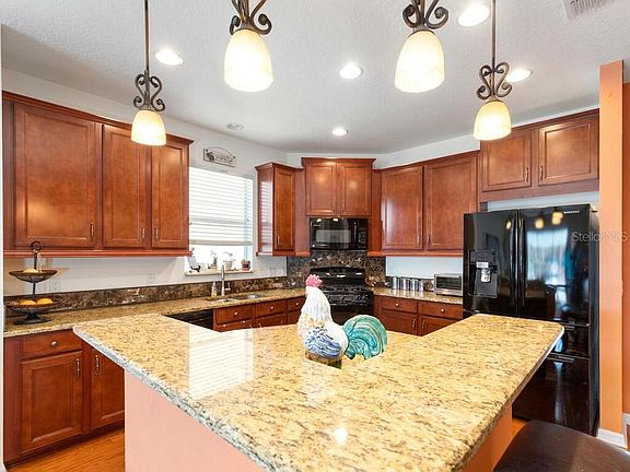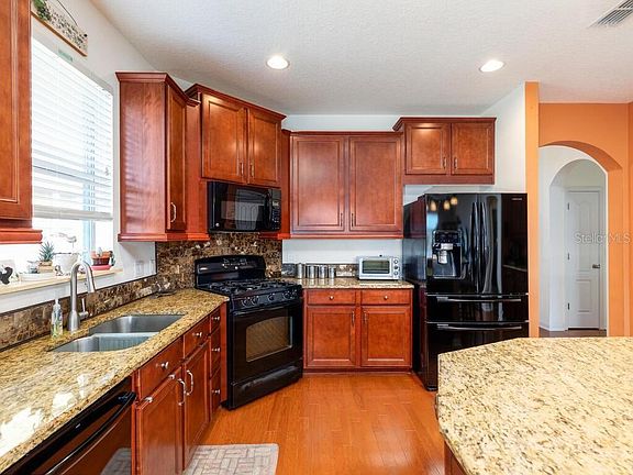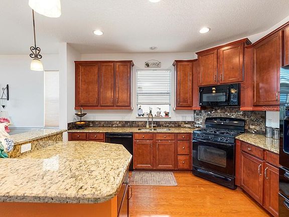 Welcome Home to this Trinity East gem. This single story, 3 bedroom plus den, 2 bath home with gorgeous pond views awaits. A quaint front porch greets you as you approach and enter through the etched glass door. A study/den located at the front of the home is a quiet, peaceful retreat. The kitchen, the heart of this home, boasts rich wood cabinets with pull outs, a large closet pantry, gas stove, granite countertops and a large island with breakfast bar. A separate counter area makes the perfect coffee/wine station or bar. As well, there's a formal dining area. The bright great room with its triple sliding doors, highlights the picturesque water view. Relax on the large extended screened lanai and watch the sunset over the glistening water. The large master bedroom features a walk in closet. Master bath has double sinks, walk in shower and garden tub. Two additional bedrooms, both with walk in closets, are located adjacent to a second bath. This home has natural gas for stove, dryer, water which reduces your electric bill! Beautiful hardwood floors throughout. Water softener, hurricane shutters and pre wired for alarm. Trinity East is a monitored, gated community which has a community playground. Low HOA and no CDD. Located near Odessa Elementary and close to shopping, restaurants with convenient access to Tampa.