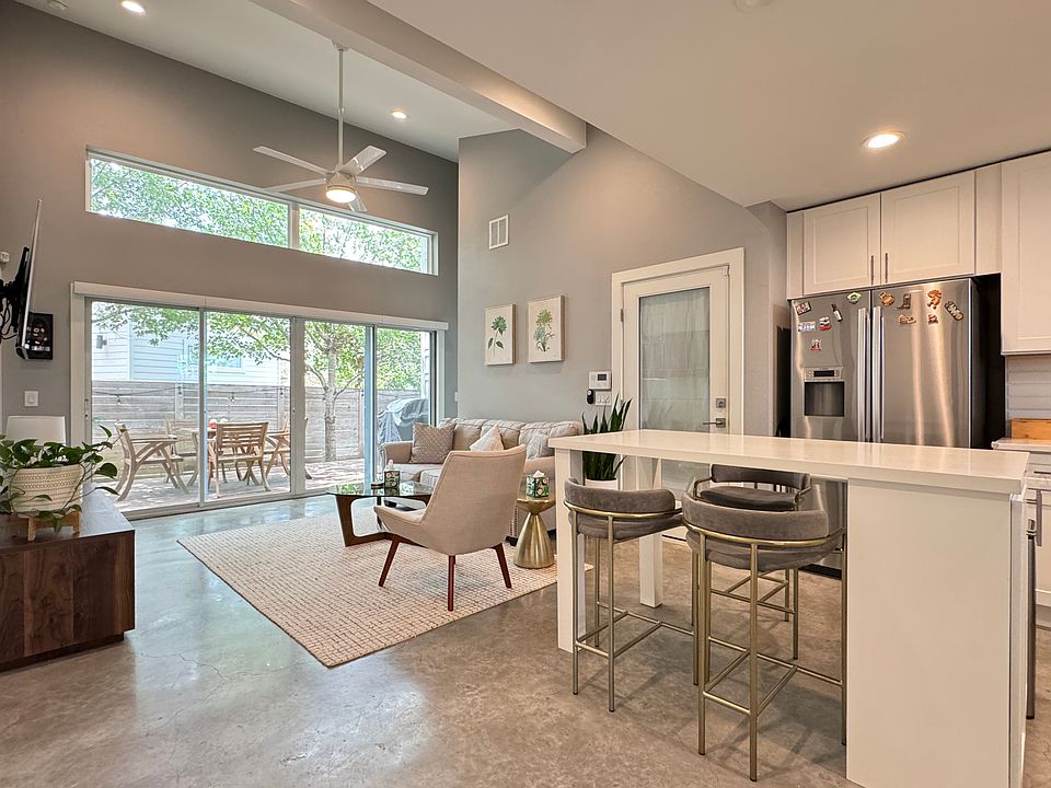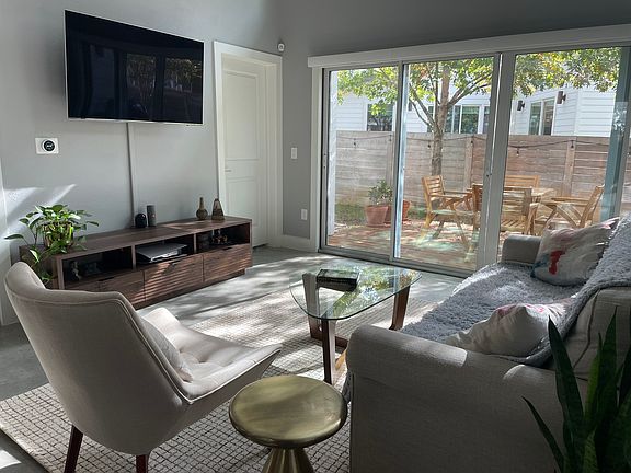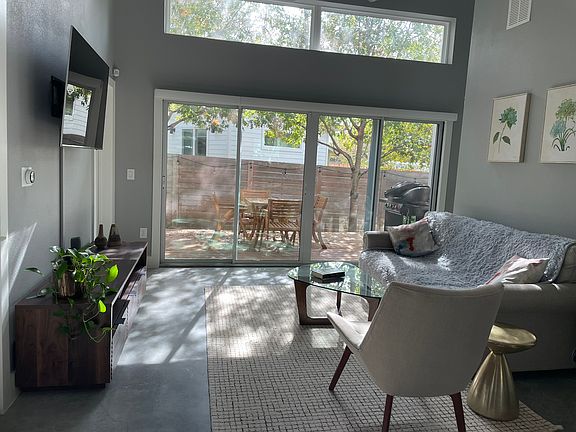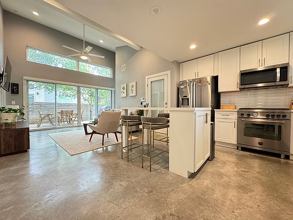 This single-story home combines modern design, everyday convenience, and a peaceful East Austin setting, all just 4 miles from downtown. Surrounded by tall trees and natural beauty, it offers the perfect blend of privacy and proximity to city life. Walk to local favorites like Palomino Coffee and enjoy easy access to nearby shops and restaurants. Step inside to sleek concrete floors, soaring ceilings, and abundant natural light throughout. The open-concept kitchen is a standout, featuring quartz countertops, white cabinetry, a Bertazzoni range, stainless steel appliances, and a custom-built island, ideal for cooking and entertaining. With two spacious bedrooms and two full bathrooms, the layout is both functional and flexible. The primary suite includes a well-designed large closet, double vanity, and walk-in shower. The second bedroom works beautifully as an additional bedroom or a dedicated home office. Enjoy the ease of no stairs, a covered garage, and an extended driveway with plenty of parking for residents and guests. Sliding glass doors open to a floating deck that overlooks a fully fenced, low-maintenance backyard, a perfect spot to relax or host. 12-month lease Non-smoking property Renters responsible for all utilities