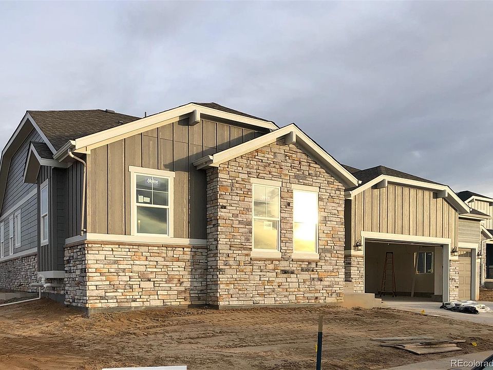 Our most popular plan! This Tenley ranch is situated on a west-facing, corner home site across from Buffalo Run Golf Course. Enjoy outdoor living from the large covered patio. Upgrades include a gourmet kitchen with an expansive designer island, stainless appliances (including double ovens) and staggered Maple nutmeg cabinets. 5" engineered hardwood flooring, fireplace with media wall and tile surround, 5-piece master bath with tiled shower pan, upgraded sinks and railing. Window coverings included. Master privately situated away from other bedrooms. Quiet golf course community with easy access to I-76, E470 and DIA.