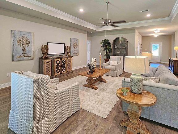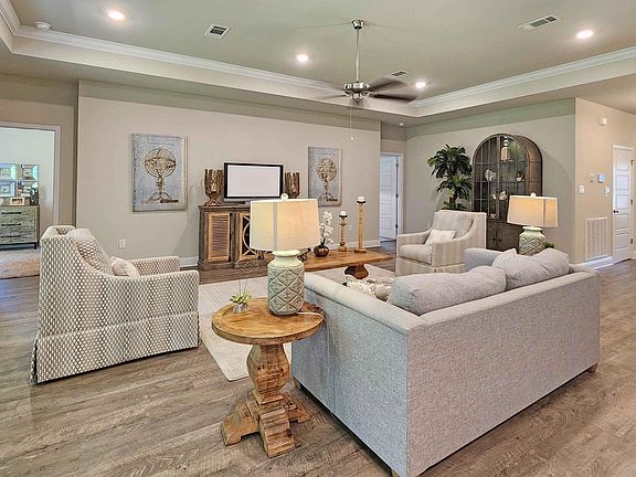 Entering the great room, you'll have views off the back covered porch. The living area is open to the kitchen and dining space. The kitchen features shaker-style cabinetry, island with granite countertops, stainless steel appliances and a corner pantry.