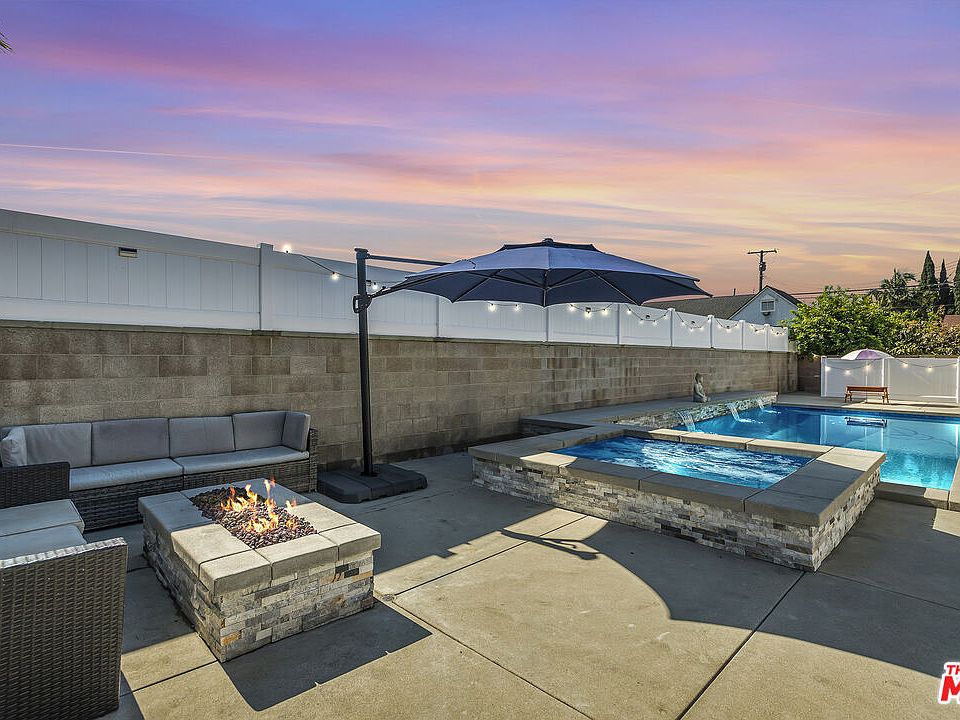Beautiful remodeled, modern pool home. The house is amazing but wait until you see the resort style backyard featuring a covered patio, sparkling heated pool with lights and fountains, a hot tub, gas fire pit and Outdoor BBQ, all installed in 2022. The interior of the home was remodeled in 2021. Nothing to do but move in and enjoy. Custom blinds, recessed lighting, hardwood floors throughout, quartz counters, black stainless steel appliances, fireplace, in-home laundry (not in garage), Central Heat and A/C. (A/C and hot water heater replaced in 2023) You're in your own private oasis in the heart of Downey. Nothing else like this in this price point. Must see!