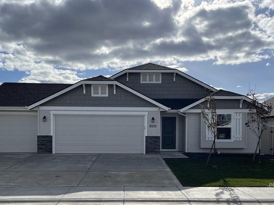 Birch Signature Series with Heritage elevation. This true split-bedroom single story has an open concept kitchen and living room, with the primary suite private and secluded. Lots of natural light makes this home choice. This home features vaulted ceilings in the great room and kitchen, upgraded kitchen cabinets and countertops, 3 car garage with external bay, enlarged driveway, upgraded full tile shower and dual vanity in primary bath, and a covered patio. Photo is of a similar home. This home is HERS and Energy Star rated with annual energy savings!