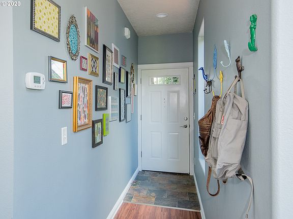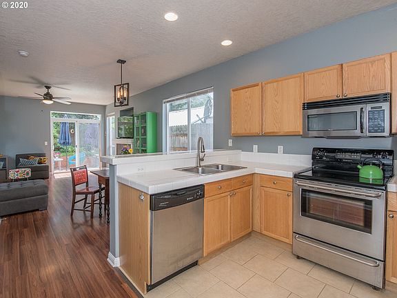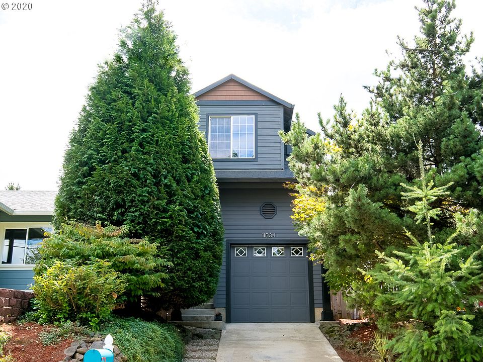 Privacy + and lots of room to move. Front entry leads to open plan kitchen/dining/living room. Slider to the back patio. 1/2 bath on main, stainless appliances, eating bar. 3 bed/2 bath on upper. Main suite w/vaulted ceilings. Laundry room, new carpet and AC! The main bedroom boasts vaulted ceilings and en suite bath. Roomy garage, long driveway. Walk to parks, close to I-205 + shopping.