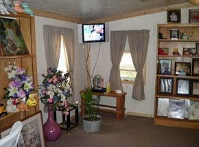 Situated off the road with a welcoming entrance and many flowering scrubs. Wonderful covered porch 16'x16' with pitched, metal roof and adjoining wood ramp. In the back is a porch with adjoining ramp leading into the 2nd Livingroom/den, which could be another Bedroom with it's own entrance. 34'x13' loafing shed ideal for horse stalls. Ample space for RV parking & boats. Lg. garden area, 3 melon patches. Well is 75 deep. Split Bedroom, open living concept & nice fireplace. Peach, apple, cherry trees.