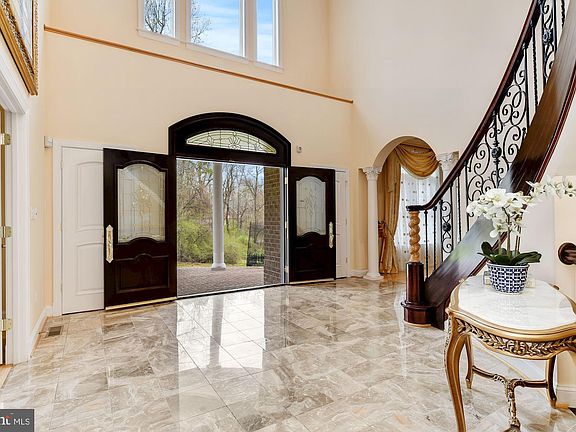 Gather well and gather often in this Mediterranean-styled estate home in Columbia. Enter a grand foyer with a dome and imported chandelier on a lift, curved stair, and marble floor. Embellished with Corinthian columns and strong crown and dentil moldings, this residence offers luxury upgrades and quality at every turn. Entertain formally in a banquet sized dining room off of the adjacent formal living room. A spacious gourmet eat-in kitchen with professional stainless appliances including a Monogram fridge and freezer, Fisher & Paykel dishwasher and D~cor gas range wrap a center island with prep sink and sink burner gas stove. Choose to dine informally inside breakfast room in a light-filled breakfast room, or outdoors on a low maintenance deck with Python balusters.Arched openings and thematic paired Corinthian columns announce entry into a dramatic two-story great room with a central gas fireplace and atrium door to the deck. A secondary entry, arrival center, laundry, back stair and main level en-suite bedroom with a private attached bath complete the main level. Upstairs, a second laundry center services bedrooms. Luxury features accompany the master suite offering a sitting room, dressing area and dual walk-in closets. Decompress in a luxury master bath with separate vanities, dual towers, spa bath and shower.Downstairs, gatherings and festivities are made easy with a recreation space, fireplace, dance floor, full wet bar, back bar, billiards area, and home theater. On the other end, an Au-pair/guest en-suite bedroom, full bath, exercise room and playroom add to the versatility to this spectacular home. Access the covered patio and rear lawn with multiple sets of atrium walk-out doors. Above the covered patio, a commanding wrap-around deck overlooking the rear lawn is ready for any occasion while bringing the outdoors inside. Come home to a stately home built with enduring quality and luxury, surrounded by professional lighting and landscaping that will impress the most discerning buyer.
