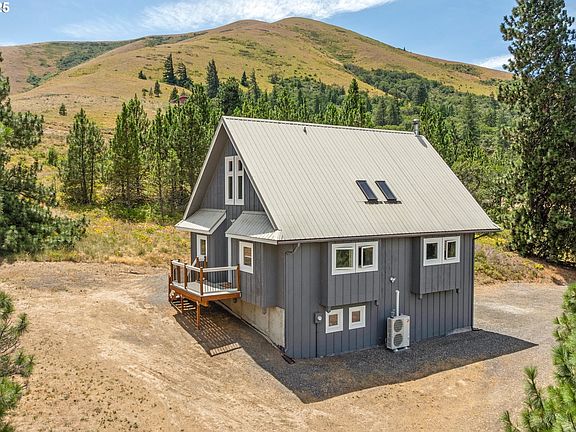 Whimsical Countryside Retreat with Sweeping Mountain Views.Perched atop a gentle hillside and surrounded by 21.85 private acres of rolling countryside, this enchanting estate offers a rare blend of rustic charm, refined comfort, and serene natural beauty. Abundant wildlife, peaceful rolling hills, and breathtaking mountain views create an idyllic backdrop for this one-of-a-kind retreat. The home itself is full of warmth and character, with hardwood floors throughout, a cozy wood burning fireplace in the living room, and thoughtfully refurbished parlor doors adding vintage charm between the kitchen and dining areas. Skylights throughout the home invite streams of natural light into the space, enhancing its peaceful, uplifting atmosphere. On the main level, you’ll find a comfortable bedroom and a full bath, while upstairs, the second bedroom feels both elegant and inviting with peaked ceilings, two large closets, and beautiful skylights that fill the room with sunshine and a sense of calm. A whimsical sleeping loft adds extra space, perfect for guests, creative pursuits, or quiet reflection.The home has been tastefully updated throughout and is equipped with a heat pump for both heating and cooling, ensuring comfort in every season. A large garage and generous basement offer excellent storage and parking, with the potential to finish the lower level into additional living space if desired.Whether you're searching for a tranquil weekend escape or a full-time countryside sanctuary, this unique property offers unmatched privacy, charm, and connection to the natural world—all just a short distance from Portland, yet a world away.