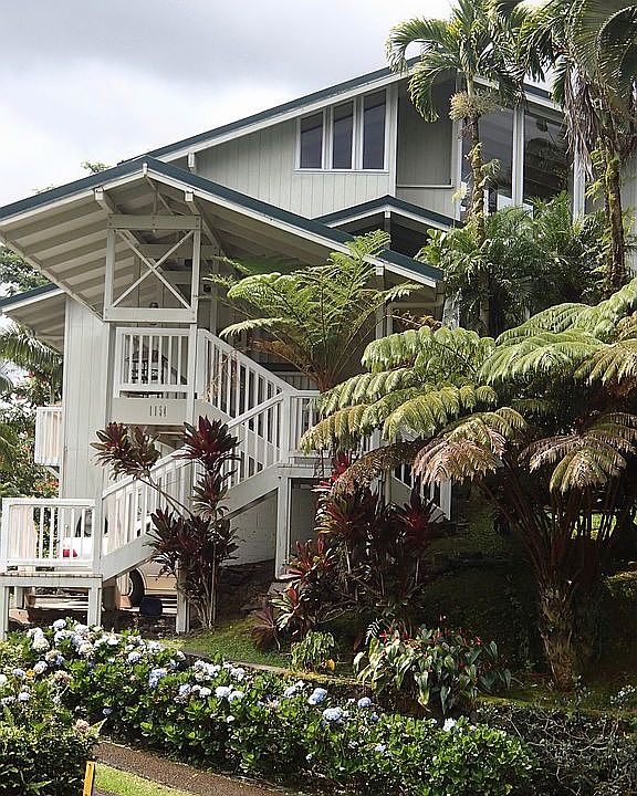 One-of-a Kind Designer Home in Ainako Terrace. Designed by Architect George Henegan and built by Elliot Merk, this stunning multi-level home takes full advantage of its private, lush setting of palms and flowering trees, complete with the sounds of a gently flowing stream at the base of a nearby hill. Floor to ceiling windows in the living and dining rooms complement the large windows throughout the home to provide light and beautiful views of the tropical forest behind the house. Great ventilation from all the windows and special air flow inserts in the house keep it breezy and cool. Lots of outdoor decking and a screened-in lanai extend the living areas. The exposed high beam ceilings, polished oak hardwood floors, free-standing living room fireplace, large glass doors separating the living room and lanai, hand-painted Italian tile kitchen floor, and blond mahogany stair railings and counter trim are details that add to the beauty and comfort of the house. The home's location at the end of a cul-de-sac in Ainako Terrace adds to its appeal, with underground utilities, proximity to Hilo Medical Center and downtown Hilo, and inclusion in the De Silva Elementary School district. It combines the protection of privacy, a neighborhood feeling, and a tropical setting.