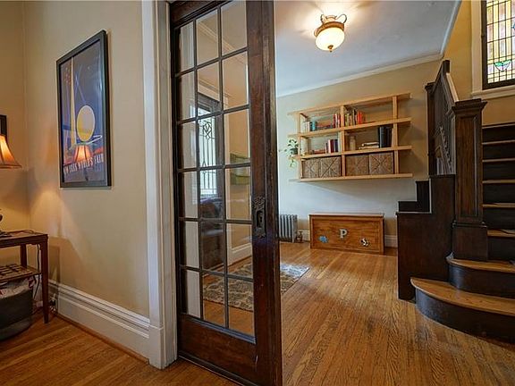 ~ Charming 1900's Arts & Crafts Morningside home on a nicely wooded block ~ Lots of original Craftsman features including a large front porch, decorative rafter tails, stained and leaded glass, lovely hardwood floors, glass pocket doors, boxed ceiling in dining room, original mantels, original tin ceiling and Carrara glass in the kitchen ~ The gracious foyer features a fabulous staircase and a built-in bench ~ The spacious dining room has vintage lights adorning the boxed ceiling, pocket doors and a bank of windows facing south ~ The retro kitchen has two very cool built-in pantries ~ The private rear yard is fenced, with nice landscaping and a curved Omni stone patio ~ There is potential for off street parking if the fence were to be removed ~ All box gutters are newly restored ~ New exterior paint ~ New Pella windows in LR and DR~ Terrific location...easy access to hospitals, universities, Highland Park and the Pittsburgh Zoo ~