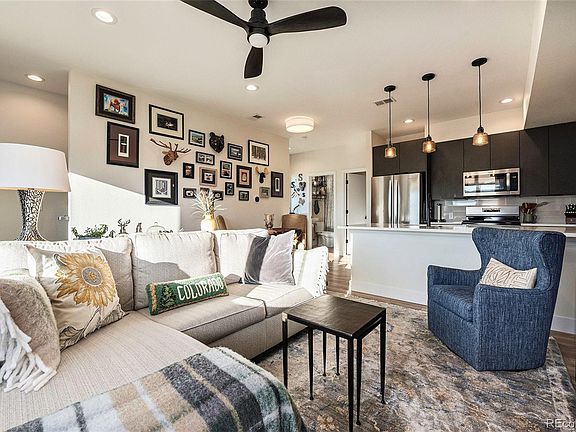 This 3-story, end unit, built in 2020 has unobstructed views of the park across the street and the front range in the distance. You'll love sitting on the 3rd level balcony for a relaxing morning cup of coffee as the sunrise lights up the front range, enjoying a beautiful sunset on the Rocky Mountains, or taking in the splendor of an incoming winter snow storm through the large windows from the comfort of the living area or the primary bedroom. Upgrades that the owner has added since the home was built include luxury vinyl flooring throughout the living area, kitchen & bedrooms, quartz countertops in the kitchen & bathrooms, tile flooring in the primary bathroom shower, all doors have had the hardware updated to black, all sinks and showers updated to black hardware, ceiling fans in the living area & primary bedroom, higher end "top down/bottom up" blinds on all the windows, and ELFA shelving in all the closets and garage! A small fenced area outside the front door with artificial turf creates a cozy, homey feeling as well as providing space to let the dog out for some fresh air! Close to the Belmar area for groceries, restaurants, shopping & entertainment. Easy and quick access to downtown and to the mountains.