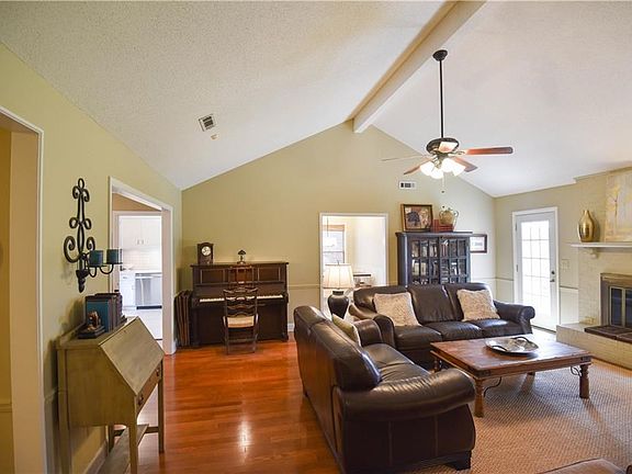 Remarkably updated, all-one-level home, features a BRAND NEW HVAC, covered front porch, a sizable Great Room w/ hardwood floors, a woodburning fireplace, formal dining, breakfast area. Upgraded kitchen features quartz counters, refinished cabinetry, stainless appliances, & a bar area for counter stools, & large laundry nearby. Master suite features a walk-in-closet, his & her vanities, & a separate room w/ tub/shower/toilet. The secondary hall bedrooms are carpeted, w/ ceiling fans, & custom closet organizers. The playroom contains a separate, standalone HVAC, recessed lighting, ceiling fan, & an attic with aluminum pull-down stairs. The mother-in-law suite/4th bedroom provides a half bath, ceiling fan, mirrored closet doors, plenty of windows, & 2 skylights that provide ample ambient light during the day. The flat backyard is completed fenced, has a separate, fenced area for pets, and comes with a storage building, complete with an accessible door & built ins for tools & storage.