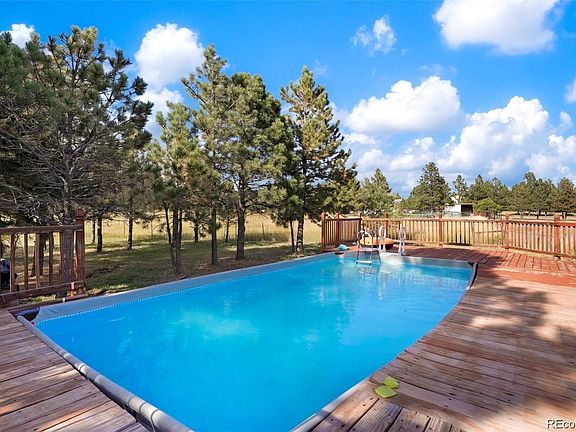 UPDATES! New carpet on main level, new paint, new furnace & A/C to be installed prior to close! Experience the enchantment of rural living at 11541 Ridgewood Way in Kiowa, CO. This warm and welcoming residence is gracefully positioned on just over 3 acres, providing an expansive canvas for your outdoor dreams to flourish. Revel in the outdoor oasis featuring a newer, heated, saltwater above-ground pool, a soothing 6-8 person hot tub, and multiple fire pits—creating the perfect setting to savor both sunrises and sunsets from the patios.