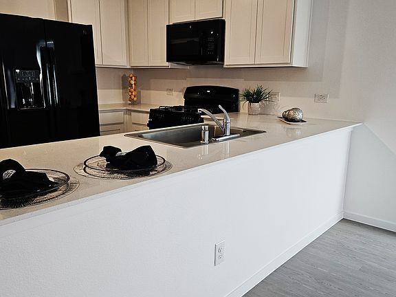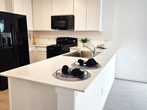The kitchen is equipped with marble countertops, black appliances (including a refrigerator), a pantry, and 42" white cabinets. Additional amenities include a sprinkler system, a tankless water heater, and a fenced private backyard.