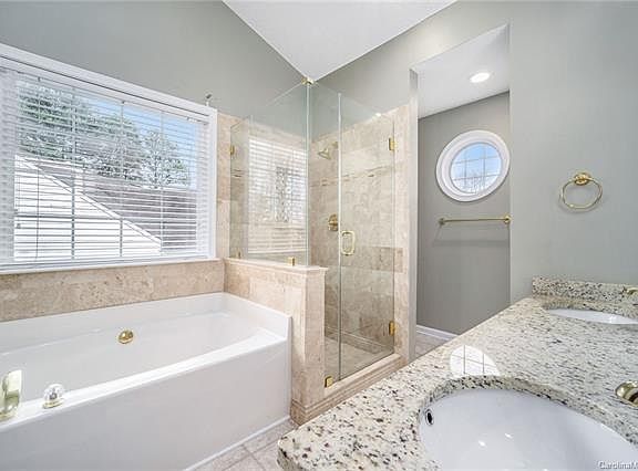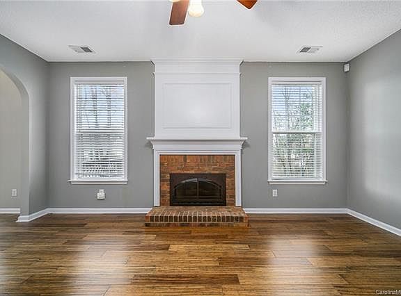 This Charlotte two-story home offers gas heating, granite kitchen countertops, a breakfast bar, a walk-in master bedroom closet, a den, a deck, and a two-car garage.