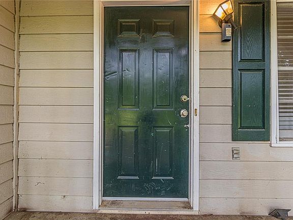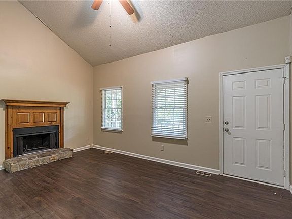 Dont miss this great split level with rocking chair front porch! Spacious family room has an open concept with dramatic cathedral ceiling, stone fireplace and is completely open to dining area and kitchen with wood cabinets, electric range and dishwasher. Great for entertaining! Up a few stairs to owners suite with tray ceiling double sink vanity, walk in closet, garden tub and separate shower. Bedrooms 2 & 3 a spacious have ample closet and share a full bath. Lower level has large bedroom with full bath. Great outdoor space includes a wood deck and private, wooded backyard. Close to I-20 and Crowell Rd. Please note, this home shares a driveway with the neighbor. Please do not park in front of the home to the left or block driveway. **Home is being sold AS-IS**
