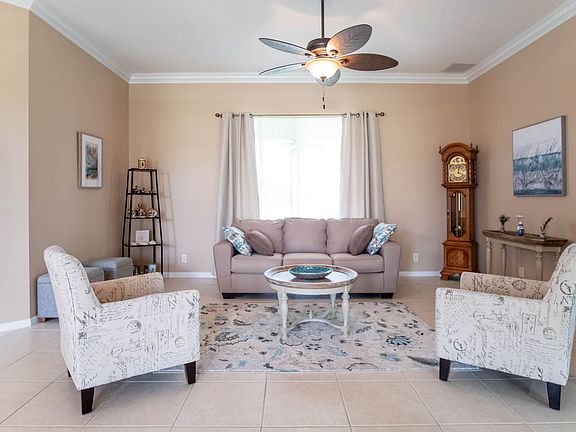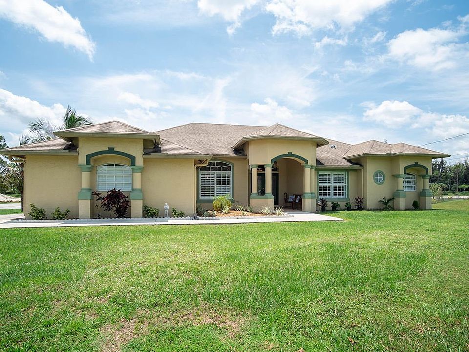 Corner lot on two paved roads and two dead end private and quiet streets. This home is immaculate and needs nothing. Beautiful double door entrance, split plan offers 3 bedrooms 2.5 baths, large office, formal dining room Beautiful kitchen with granite counter tops, newer appliances. open floor plan. Crown molding in living area and master bedroom with knock down ceilings in all rooms. Brand new plantation shutters throughout the home. New interior paint. Large master bedroom boasts his & her closets and tray ceiling. Master bath has dual sinks, separate shower and tub. Hurricane shutters. New well head, new well pump and new water filter system. 2 sheds on concrete stay. Sellers are relocating for work, sad to leave this quiet friendly neighborhood and their beautiful acreage home