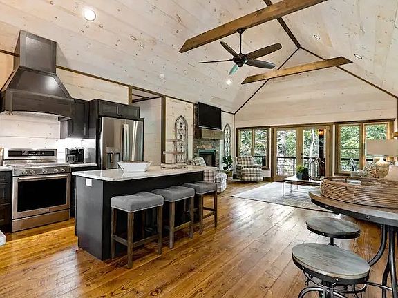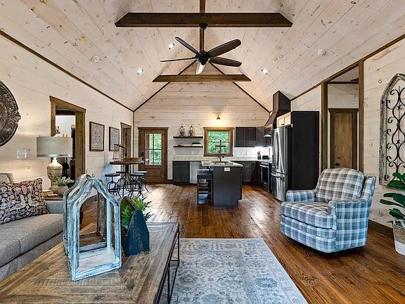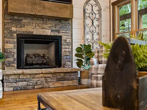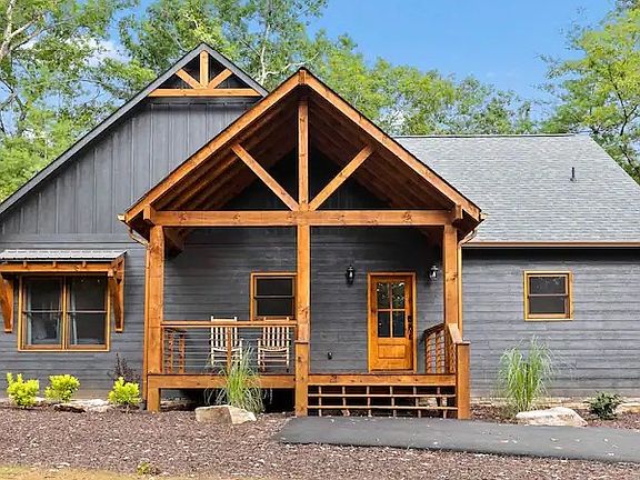 Rustic Cottage on a babbling creekfront lot and 10 minutes to Downtown Blue Ridge! Low maintenance concrete board siding, hardwood flooring, custom kitchen cabinetry w floating shelves, open great room with cathedral ceilings, MBR & 2 additional bedrooms on the main level, beautiful rock fireplace, oversized decks with an outdoor fireplace, great rustic detail to remind you why you came to the mountains! Full finished basement will feature the 3rd fireplace, bonus/rec room, 2br's and an additional room being used as a game room! Furnishings may be included on a separate bill of sale. SHORT TERM RENTALS ALLOWED.