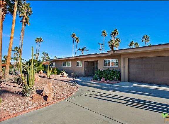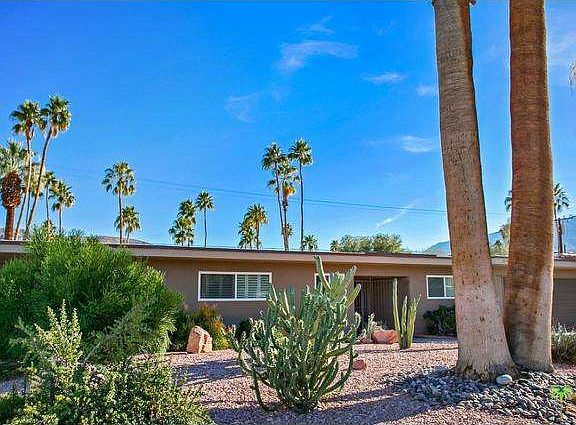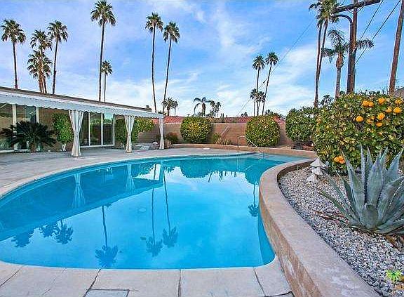 This lovely 3 BR, 2.75 BA mid-century home with a pool, on fee land, is one of the lowest 3 BR homes for sale in Twin Palms in Palm Springs South. Features abound with desert landscaping, double pane windows and sliders, spectacular mountain views from inside and out, south facing rear yard, new 250,000 btu pool heater, citrus trees, covered patio and more. Two of the bedrooms, each with their own bath, are on opposite sides of the house, offering privacy. The back yard also provides covered patio and a built-in BBQ.