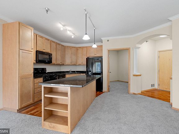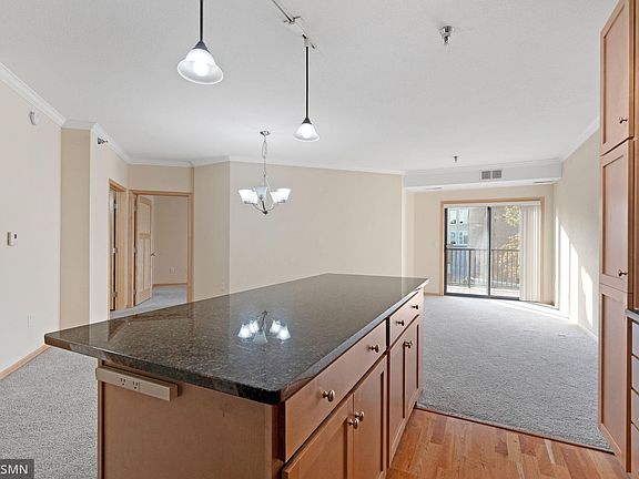 Very well-maintained St. Louis Park condo with 2 beds and 1 full bath! Nice open layout with a huge center island, granite, maple cabinets, countertop seating, stainless appliances, ceramic floors and in unit laundry. Living room walks out to the balcony. The primary bedroom is large with a walk-in closet and the 2nd bedroom has could easily be a work from home space. The building has an exercise room, party room and shared patio space. Underground parking space comes with the unit.
