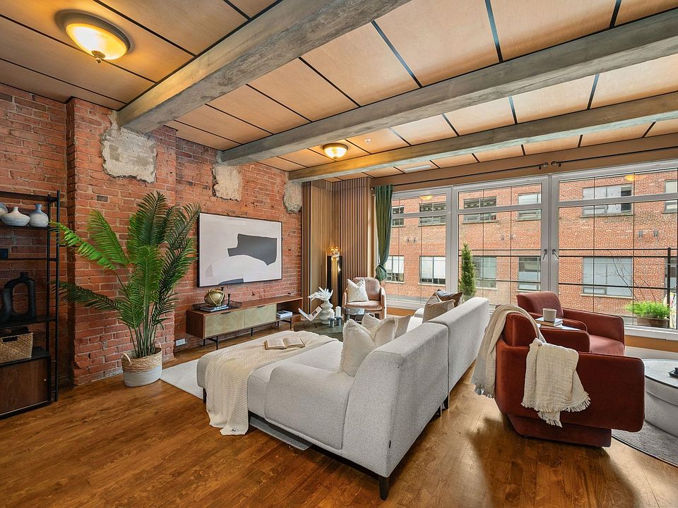 Exposed brick wallsSoaring ceilingsMassive windowsRenovated kitchenSteps from the seawallHistoric characterContemporary luxury