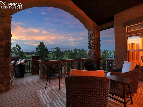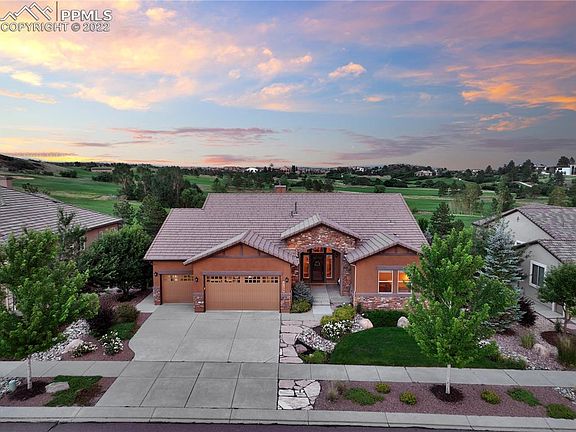 Enjoy the timeless beauty of a former MODEL situated on a Walkout PREMIUM GOLF COURSE Lot along the 12th Fairway of “The Club at FLYING HORSE! Extra insulation offers quiet and lower utility costs, also no need to wait for new premium "lot releases": Here you will find breathtaking views of a Tom Weiskopf-designed Golf Course from the almost floor to ceiling wall of windows and sliding glass doors backing to the golf course! This is true One-of-a-Kind main level living home, that is loaded with Designer Quality Finishes and an ever enduring style! The Vaulted ceilings in the main Living Area and taller ceilings throughout give you that Wide Open Floorplan "feel". This Elegant 5 bed 5 bath Ranch Plan also features an oversized 3-car Garage that is fully insulated and finished. Sophisticated neutral interiors include hickory random-width flooring, gourmet kitchen, granite countertops, Custom kitchen cabinets, new lighting, fine window treatments, surround sound speakers and stone fireplaces on both levels. As you enter you will experience the invitation for true indoor/outdoor "COLORADO LIVING" especially from open Living room, Kitchen, Nook, and separate dining to an extended covered composite deck with privacy and of course relaxing views! A beautifully designed outdoor custom wood ceiling is not to be missed so look up!! The finished walkout 9ft basement offers a custom wet bar, Family Room (movie theatre surround sound), a Junior Guest Suite, plus 2 additional baths and 2 more large bedrooms plus a walkout to an extended patio and newly installed maintenance-free turf back yard. This home is waiting for YOU! This HOME is perfectly situated close to I-25, Amenities, Airforce Academy, The Private Club, Restaurants, Top Golf, Hiking, Parks, Events, Entertainment, Hospitals and about 50 minutes to downtown Denver! Easy to show.....