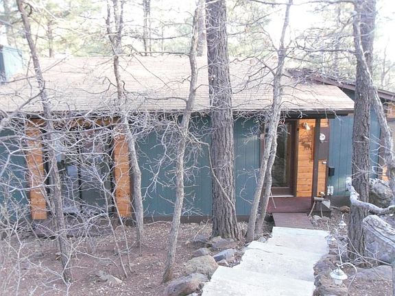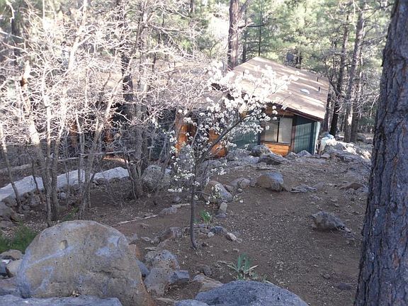 Absolutely delightful two bedroom, two bathroom cabin tucked away in the pines, backing Munds Canyon. Serenity! Peaceful. Like you are along in the woods. Two decks placed in the air looking at the hillside of trees. Listen for the seasonal creek, watch the birds and nature from your expansive windows or air decks. Fenced back yard for the pets. Soaring ceilings, focal fireplace with awesome stone front. Split bedrooms each with a bath and a stackable washer/dryer off the kitchen. Being =sold mostly furnished with top notch, contemporary furniture. Topside parking with room for a giant RV or several cars. Very private and secluded. New roof! Immaculate condition.