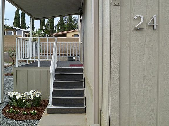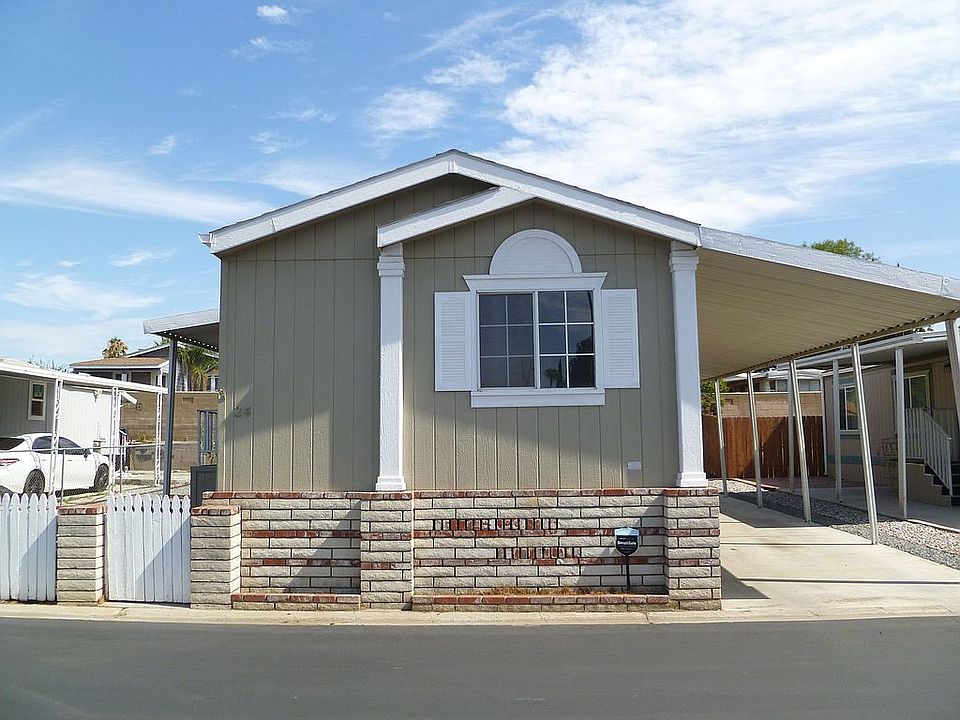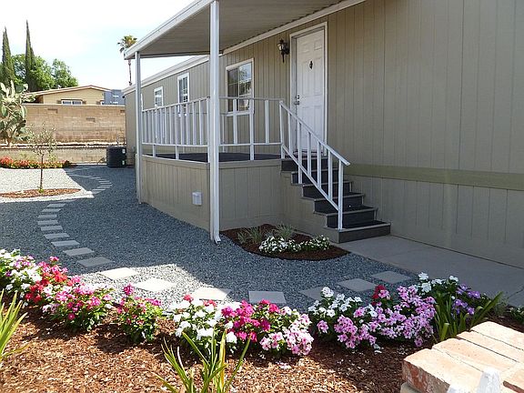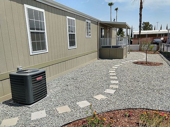 Remodeled 1997 mobile home. 3 bedrooms and 2 bathrooms. This is a 920 sq ft single wide with a large beautifully landscaped yard of rock and flowers. It really does feel much bigger once you get inside. The floors are water-resistant grey vinyl planks throughout the home. The home is newly painted with a popular light grey wall and white trim. Both bathrooms have lovely new vanities and new toilets. The kitchen has a new quartz countertop and slow-close cabinet doors. The master bedroom has its own bathroom. Brand new central A/C plus central heat. NO swamp coolers or window A/C’s just cold air all through the home. Plus hookups for a washing machine and dryer. The park, Santiago Parkside Estates, has a wonderful playground and a pool. And all park residents have access to the park clubhouse for parties and events. Once you move in you’ll be less than 5 minutes from shopping (Walmart, DD’s, Ross, El Super), fast food and restaurants. The 10 Fwy is only 5 minutes away.