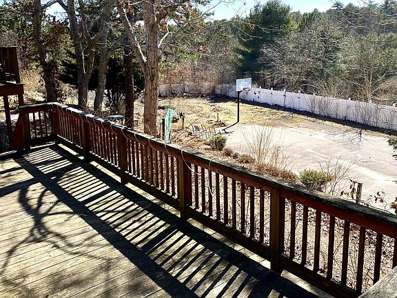 This Cape Style Center Chimney home has an Open Floor Plan with Cathedral Ceilings and Exposed Beams. The Kitchen Opens to a Large Family Room with a Two-sided Gas Fireplace, Hardwood Floors and a Sliding Glass Door Leading out to a Large Deck. The Formal Living Room Also has an opening to the Gas Fireplace. The Formal Dining Room has Wood Floors and a Built-In Corner Hutch. There are Views of an Old Cranberry Bog, a 2-Car Garage with Pull-Down For Storage, and A Partially Finished Walk-Out Basement. There is also a Private Basketball Court or Possibly Use it for a Pickle Ball Court, the Latest Craze. A Circular Driveway Leads to Garage. Must see to appreciate. Some TLC needed. Passing title 5 in hand. Home is being Sold As-Is. Information deemed accurate, Buyer and Buyer agents should verify facts in listing. Third Party Approval Required Prior to Close.