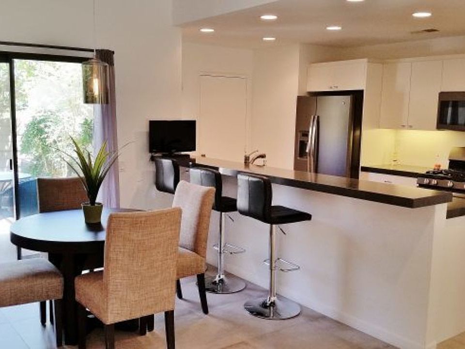 Absolutely gorgeous remodeled unit! Spacious open 'great room' concept, open remodeled kitchen, new appliances, all-tile throughout. New sliders. High ceilings, custom shades, dining area, light, bright and airy. Nice separation of bedroom en suites. Master suite includes a large walk-in closet, spacious bedroom with patio access and beautifully remodeled master bath, all tile, walk-in shower, designer accessories. Guest en suite includes a completely remodeled bath with custom designer tile walk-in shower and bedroom with patio access. South facing backyard and over sized patio area, views and close proximity to the pool/spa area. Nice entry with small patio off dining area. This is one of the best contemporary remodels in the Rose Garden. With over 14+ acres landscaped grounds, pools, spas, tennis & pickle ball courts all close to downtown/entertainment area, major shopping, library, parks, biking, Mizell Center and more! Your desert dream condo awaits!
