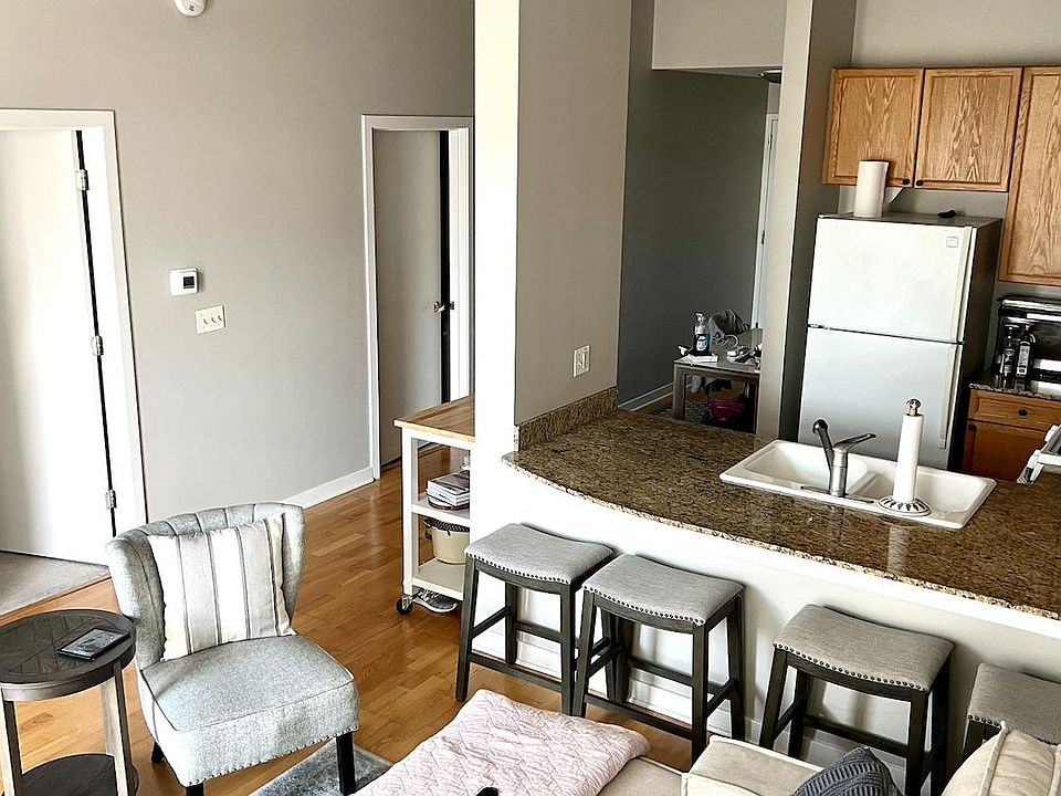 Rarely available one bedroom soft loft! (Available NOW) Highly sought after West Loop, Madison Ave. Offers an ideal blend of residential living with trendy restaurants and nightlife. Amazing location is steps away from award winning restaurants, shopping, and corporate offices. This professionally managed elevator building was constructed as condos; it includes a secure lobby with fob access, renovated common areas and heated garage parking. This bright, north facing unit has tall painted concrete ceilings. The spacious entry has an oversized coat closet and a laundry closet. The combo living/dining room has a gas fireplace, a TV niche, and a roomy balcony overlooking vibrant Madison Ave. The kitchen has maple cabinets, Whirlpool appliances and a granite breakfast bar. The fully enclosed bedroom includes windows plus two large walk-in closets, and direct access to the bath. The double sink bath offers amazing granite counter space and storage, and a combo 6ft soaking tub/shower. Heated garage parking space can be included for extra fee ($250). Pictures included are old & new. New include colors of gray/white (no red). ANNUAL