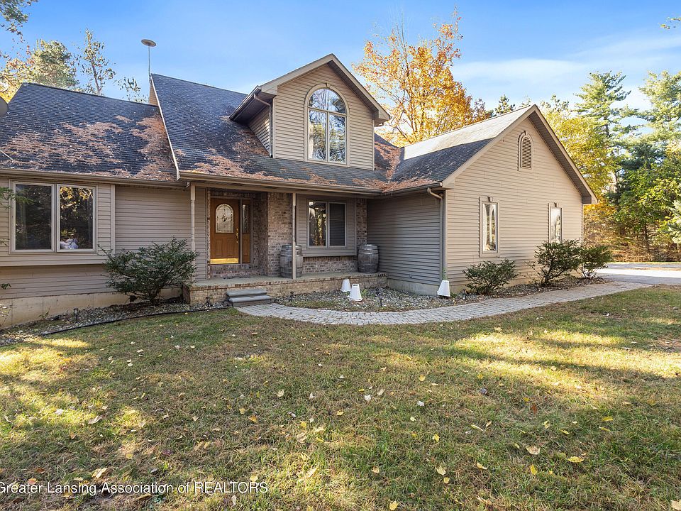 Tucked away on 7.3 wooded acres just north of St. Johns, this executive home offers nearly 3,000 sq ft of living space with 4 bedrooms and 3½ baths. The main floor features a spacious owner's suite with a jetted tub, a great room with cathedral ceilings and a 15-ft stone fireplace, main-floor laundry, and a flexible office or den. Recent updates include fresh paint, new plank flooring, and newer carpet throughout. The kitchen features brand-new Whirlpool black stainless steel appliances, custom oak cabinetry, and a bay-window dining area that opens to the back deck overlooking the property. The finished lower level includes daylight windows, a wet bar, a full bath, and a 4th bedroom or office—perfect for entertaining or guests. Outside, the attached insulated 2.5-car garage is complemented by an incredible 40x60 heated pole barn with 14-ft ceilings, concrete floors, 3-phase power, and multiple insulated doors—ideal for storage, business, or hobby use. Set on peaceful, wooded acreage with a pond, firepit, and plenty of wildlife, this property offers space, privacy, and versatility—all just minutes from town.